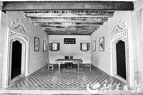 宅第的主廳堂是“四點(diǎn)金”房局,兩側(cè)火巷(也稱“雙背劍”)則仿北京故宮的東西宮格式,分成若干個(gè)小院落,構(gòu)成大院套小院,大屋帶小房的住宅網(wǎng)絡(luò),加上梯樓、天橋和通廊,縈回曲折,四通八達(dá),甚至樓屋頂還用紅磚鋪有人行道。上下相通,撲朔迷離,陌生人進(jìn)去如入迷宮。