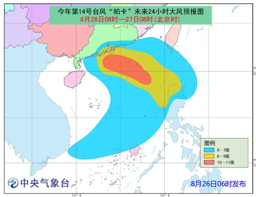 中新網(wǎng)8月26日電 據(jù)中央氣象臺網(wǎng)站消息,今日6時(shí)中央氣象臺發(fā)布臺風(fēng)黃色預(yù)警。臺風(fēng)“帕卡”將于27日白天在廣東深圳到陽江一帶沿海登陸(28-33米/秒,10-12級,強(qiáng)熱帶風(fēng)暴級或臺風(fēng)級),登陸后“帕卡”將轉(zhuǎn)向偏西方向移動, 27日晚上移入廣西境內(nèi)(18-25米/秒,8-10級,熱帶風(fēng)暴級或強(qiáng)熱帶風(fēng)暴級),強(qiáng)度逐漸減弱。
