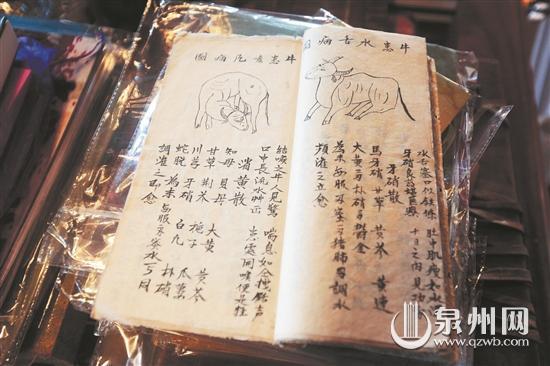 這些藏書中也不乏一些“趣書”。朱先生拿出一本新中國成立前的手抄本書籍,名為《針牛穴道》,是介紹給牛治病的,翻開一看,甚是有趣。開篇是“考證針牛穴道圖形”,畫工精美,栩栩如生,精壯的牛兒身上標(biāo)記了35個(gè)穴道;往下,分門別類記載了“?;妓莶煌ā⑴;枷x子進(jìn)耳、顫冷咳嗽、打肋腸結(jié)”等數(shù)十種牛兒病癥;每種病癥中,對(duì)應(yīng)一幅病牛體征圖畫,形象生動(dòng),接著介紹如何用中藥或生活食材治病。那時(shí)的耕牛既是重要的勞動(dòng)力,也是一戶農(nóng)民家庭的最大財(cái)富,給病牛治病自然是大事,《針牛穴道》就記載了運(yùn)用中醫(yī)給牛治病的知識(shí)?!翱催@本書,可見中醫(yī)博大精深,人民也有大智慧?!?/p>