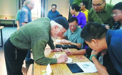 圖為10月29日,大西長(zhǎng)利(左一)在位于朱紫坊的福州市漆藝術(shù)研究院現(xiàn)場(chǎng)傳授日本漆藝的蒔繪技藝?!吧P繪”即使用加入金、銀等貴金屬屑的生漆,用其在漆器等物件的表面描繪出各類(lèi)圖案的過(guò)程。由于其含有金銀的光澤,在做完推光處理后,會(huì)顯得極為華貴。(段金柱 攝影報(bào)道)