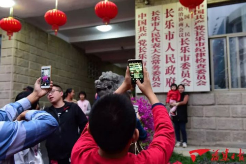 很多長樂市民紛紛在長樂市委市政府的牌匾前合影留念。