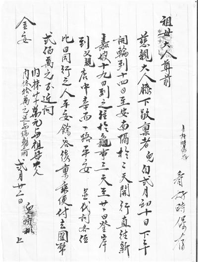 從廈門、汕頭往新加坡,現(xiàn)代輪船用了(連在安南逗留二天)10天,到“於龜事”3天,到岸登陸后馬上向家里托寄僑批,很可能這200萬元是向父親店中先預(yù)支。