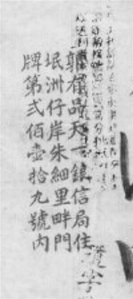 1906年丙午年,從“垊”(菲律賓馬尼拉)的天一封可見一橄欖形紅戳,上面可見“垊洲仔岸布店 138號 郭有品信局 郭曲沃林仰理信”。布店商品干凈干燥,正適合代理僑批的要求。另有“郭有品天一銀信局 住垊州仔岸朱細(xì)里畔門牌第二佰一十九號內(nèi) ” 三排無框紅條戳。經(jīng)請教王和貴、鄭來發(fā)先生,他們說“朱細(xì)里”是漳州話的“賣雜細(xì)”,還有煙雜店、灼(燭)店(拜神用臘燭神紙),這些店鋪與當(dāng)?shù)厝A僑接觸面甚廣,等于為郭有品為天一批郊做很實(shí)用的廣告。