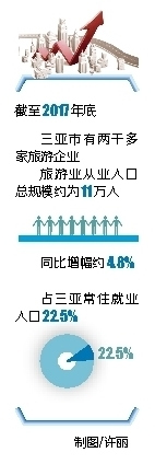三亞旅游發(fā)展?jié)摿θ绾危繑?shù)據(jù)透露出樂觀答案。根據(jù)《白皮書》統(tǒng)計(jì),截至2017年底,三亞市有兩千多家旅游企業(yè),旅游業(yè)從業(yè)人口總規(guī)模約為11萬(wàn)人,同比增幅約4.8%,占三亞常住就業(yè)人口22.5%,超過1/5。其中,涉旅行業(yè)中,從事旅游酒店、旅游景區(qū)、度假公寓行業(yè)人才數(shù)量尤為突出,三大行業(yè)旅游人才數(shù)量逾7萬(wàn)人,成為該市旅游人才結(jié)構(gòu)的重要組成部分。