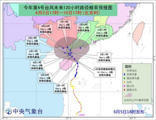 據(jù)中央氣象臺消息,南海熱帶低壓于今天上午8時在南海中部海面加強為今年第4號臺風(fēng)(熱帶風(fēng)暴級),中心附近最大風(fēng)力有8級(18米/秒),中心最低氣壓為996百帕。為防范此次臺風(fēng)不利影響,中國氣象局已于6月5日11時啟動重大氣象災(zāi)害臺風(fēng)四級應(yīng)急響應(yīng)。瓊州海峽航線已全線停航防臺避風(fēng)。