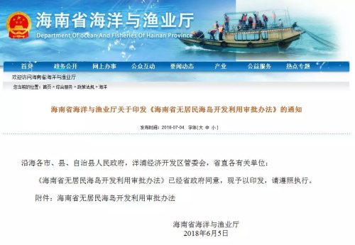 7月4日,海南省海洋與漁業(yè)廳公布《海南省無居民海島開發(fā)利用審批辦法》(下稱《辦法》)?!掇k法》明確,單位或個(gè)人申請(qǐng)開發(fā)利用無居民海島,應(yīng)向省級(jí)海洋行政主管部門提出申請(qǐng);依法取得不動(dòng)產(chǎn)權(quán)屬證書的用島單位或個(gè)人,應(yīng)按有關(guān)規(guī)定,向海島所在地縣級(jí)以上住房和城鄉(xiāng)建設(shè)行政主管部門申請(qǐng)辦理施工許可。