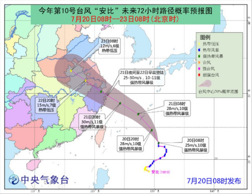 中新網(wǎng)7月20日電 據(jù)中央氣象臺網(wǎng)站消息,今晨8時,臺風(fēng)“安比”(強(qiáng)熱帶風(fēng)暴級)距離浙江象山約1160公里,中心附近最大風(fēng)力10級(25米/秒)。預(yù)計(jì),“安比”將于21日早晨進(jìn)入東海東南部,21日夜間至22日早晨在浙江溫嶺至江蘇啟東一帶沿海登陸(強(qiáng)熱帶風(fēng)暴級,10~11級,25~30米/秒)。登陸后繼續(xù)向西北方向移動,強(qiáng)度逐漸減弱。