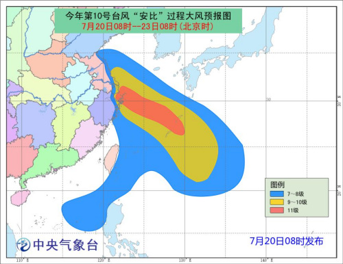 大風(fēng)預(yù)報(bào):20日至23日,華東沿海及臺灣以東洋面、東海、黃海南部的風(fēng)力將逐漸加大到7級以上,“安比”中心經(jīng)過的附近海面或地區(qū)以及舟山群島、長江口區(qū)、杭州灣的風(fēng)力有10~11級,陣風(fēng)可達(dá)12~13級。
