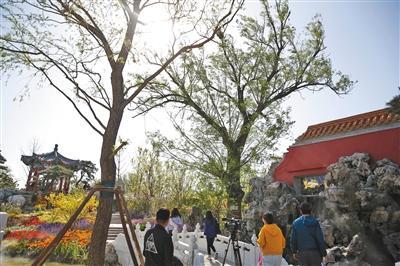 水邊有一棵大柳樹,是北京的鄉(xiāng)土樹種,園區(qū)修建時(shí),曾最早給北京園帶來(lái)春意。據(jù)了解,這株大柳樹胸徑達(dá)70厘米以上,有百年樹齡,并非移植而來(lái),而是經(jīng)過修剪復(fù)壯后,被完好地原地保留,并設(shè)計(jì)組織到園藝場(chǎng)景當(dāng)中。柳樹映著紅色宮墻,格外明媚。
