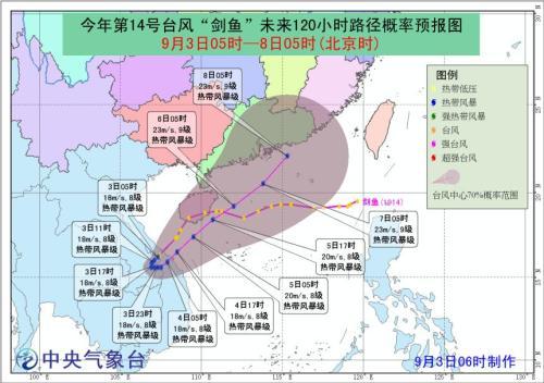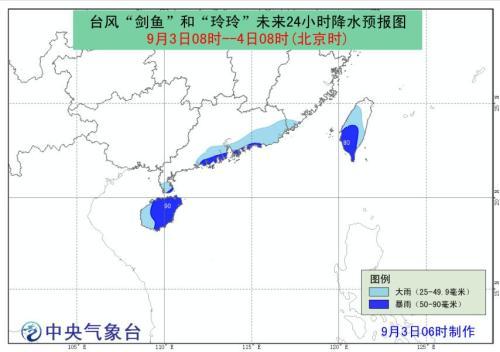 中新網(wǎng)9月3日電 據(jù)中央氣象臺(tái)網(wǎng)站消息,中央氣象臺(tái)9月3日6時(shí)發(fā)布臺(tái)風(fēng)藍(lán)色預(yù)警:昨天位于南海的熱帶低壓已于今天(3日)凌晨2點(diǎn)鐘在越南近岸加強(qiáng)為今年第14號(hào)臺(tái)風(fēng)“劍魚”,預(yù)計(jì),將于明天中午前后再次進(jìn)入南海。今年第13號(hào)臺(tái)風(fēng)“玲玲”已于今天(3日)早晨由熱帶風(fēng)暴級(jí)加強(qiáng)為強(qiáng)熱帶風(fēng)暴級(jí),逐漸靠近臺(tái)灣以東洋面,強(qiáng)度逐漸增強(qiáng),最大強(qiáng)度可達(dá)臺(tái)風(fēng)級(jí)。