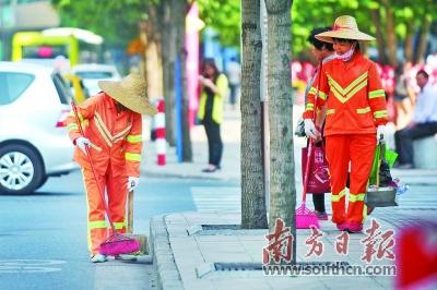 禪城區(qū)環(huán)衛(wèi)工人在路邊打掃衛(wèi)生。南方日?qǐng)?bào)記者 戴嘉信 攝