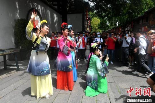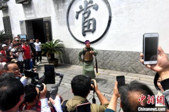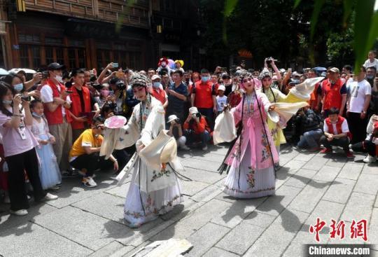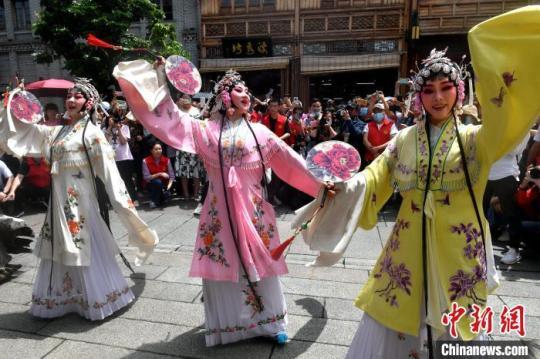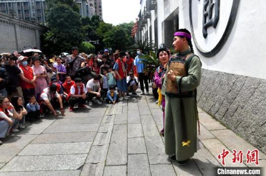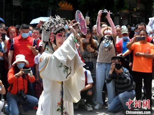 5月1日,閩劇快閃在福州三坊七巷上演,吸引許多游客駐足觀看。