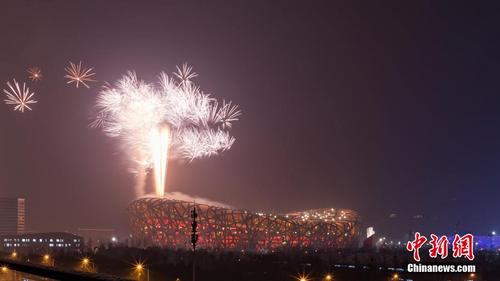 北京賽區(qū)頒獎(jiǎng)廣場 “雪花”火炬臺與鳥巢交相輝映