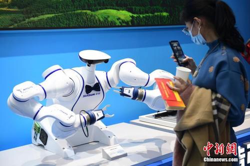 “奮進(jìn)新時(shí)代”主題成就展:雙臂協(xié)作機(jī)器人吸引參觀者