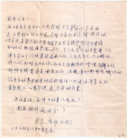 很久來(lái)并未通(信)示知、兄近接到吾弟來(lái)信候問。兄住居,有一天星期日放工回家,見到吾弟來(lái)信,憾(感)激得很!吾弟近來(lái)受分配中學(xué)教員。兄希我弟提升學(xué)問與書格,和地位能勝任光(觀)念而已。兄之在去年時(shí)候失業(yè)幾個(gè)月,后另友人介紹,進(jìn)某膠廠內(nèi)工作。兄在去年七、八月時(shí)候進(jìn)入的。初時(shí)在內(nèi)工作,不久之后轉(zhuǎn)為代羅哩司機(jī)工作,到現(xiàn)在職業(yè)尚未固定工作,但是車份是有空職位的。請(qǐng)吾弟候有固守地位,能勝任一切,通往(信)吾弟示知。家慈親大人身體健康,是詳細(xì)告稟……