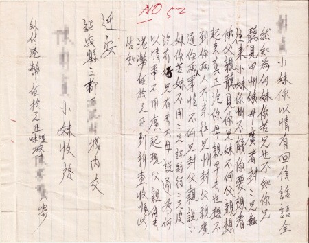 你以情(前)有回信,話語(yǔ)全然知。為何妹你若(與)兄,也不知你兄?聽見甲州姨母廣(講)者(這些)封(對(duì))二兄無(wú)往來(lái)。小妹你州(周、全部)不能(行)!你要想看(看),你父親聽見你兄妹不何(和),父親想起來(lái)真正汽(氣、生氣)!你母親早去世,想不到你兩人冇來(lái)往。兄周(全部)封(對(duì))父親廣(講)通你兩人事情不何(和)。兄封(對(duì))父親說,小妹你若(與)妹不用二兄詔題行(此三字不解)。二兄皮(脾)汽(氣)冇好,兄有長(zhǎng)、大,母(毋)說通為何。以情(前)事不用廣(講)起。現(xiàn)父親付去港幣伍拾元正,到祈查收。順此告知。