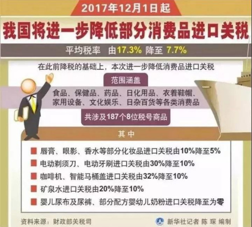 財(cái)政部近日發(fā)布消息,從12月1日起,我國(guó)將進(jìn)一步降低部分消費(fèi)品進(jìn)口關(guān)稅,平均稅率由17.3%降至7.7%。