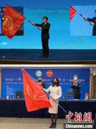 圖為甘肅省外辦主任張寶軍向韓中文化友好協(xié)會(huì)會(huì)長曲歡傳遞“一帶一路”國際青年論壇旗幟?!№n中文化友好協(xié)會(huì)供圖