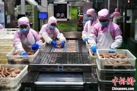 6月20日,在福州新區(qū)元洪投資區(qū),福建御冠食品有限公司員工在食品生產(chǎn)線上作業(yè)。由印尼華僑投資的福州元洪投資區(qū)是中國第一個(gè)華僑合作開發(fā)區(qū)。 中新社記者 張斌 攝