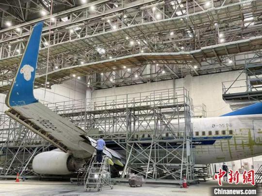 圖為工作人員正在檢查飛機(jī)噴涂。南航廣西分公司供圖