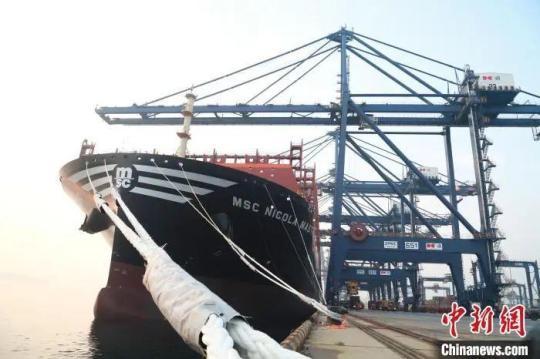 2023年6月24日,全球最大集裝箱船“地中海尼古拉馬斯特羅”輪靠泊大連港集裝箱碼頭。趙玉昕 攝
