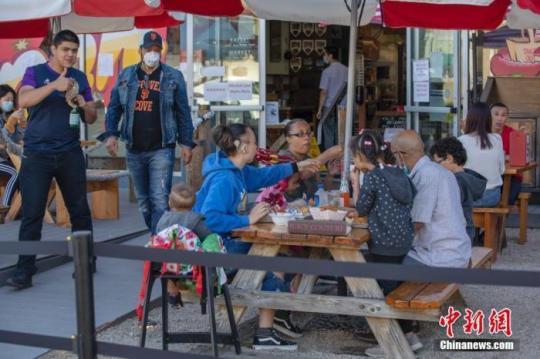 當(dāng)?shù)貢r間6月19日,美國加州圣馬特奧縣居民在一家餐廳就餐。目前,加州重啟經(jīng)濟(jì)進(jìn)入第三階段,只要所在縣允許,電影院、餐廳等高風(fēng)險設(shè)施可以重新營業(yè)。中新社記者 劉關(guān)關(guān) 攝