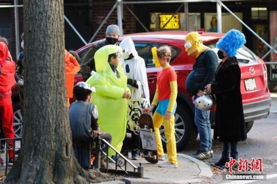 當(dāng)?shù)貢r間10月31日,美國傳統(tǒng)節(jié)日萬圣節(jié)前夜,紐約市布魯克林區(qū)穿著萬圣節(jié)裝束的孩童到各處要糖,其中一名孩童穿著卡通隔離服。中新社記者 廖攀 攝