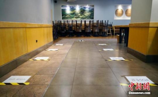 9月1日,韓國首爾市鐘路區(qū)一家連鎖咖啡廳內(nèi),桌椅全被搬空,地上貼有提示,要求等待取餐人員間隔1米以上。 中新社記者 曾鼐 攝