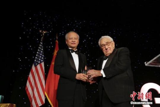 資料圖:當(dāng)?shù)貢r(shí)間2017年1月12日,中國(guó)駐美國(guó)大使崔天凱出席在紐約舉行的美國(guó)中國(guó)總商會(huì)2017年年度晚宴并致辭。美國(guó)中國(guó)總商會(huì)向崔天凱大使頒發(fā)了“中美友好使者獎(jiǎng)”。圖為美國(guó)前國(guó)務(wù)卿基辛格為崔天凱大使頒獎(jiǎng)。中新社記者 廖攀 攝
