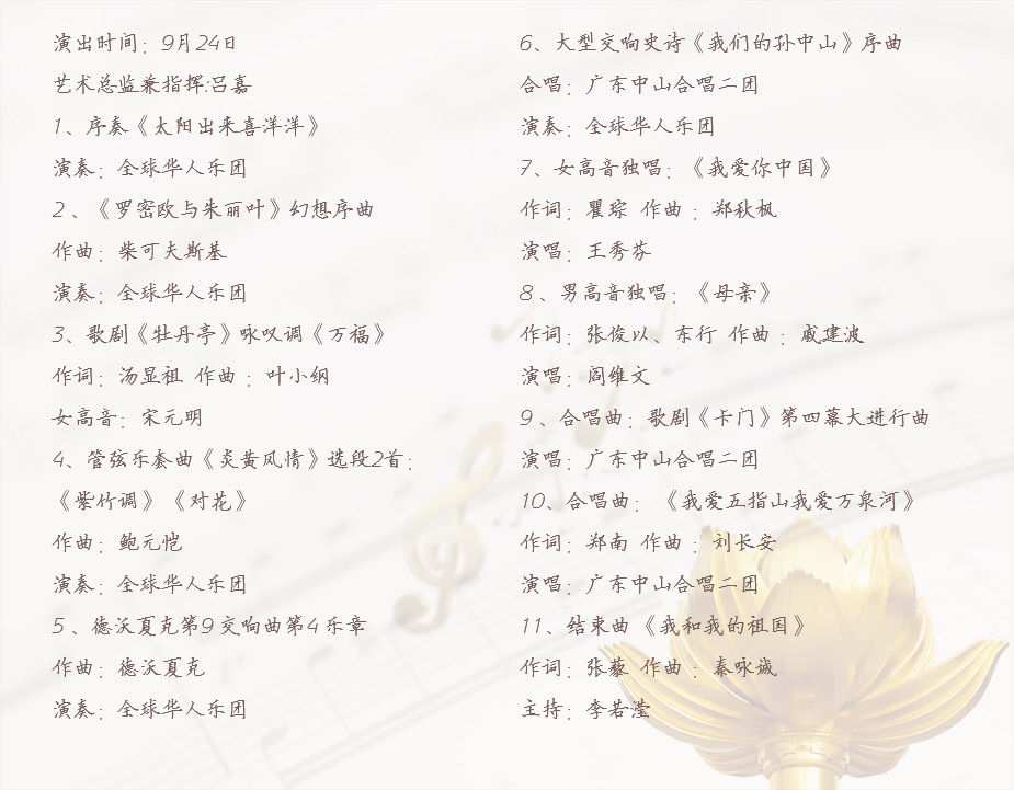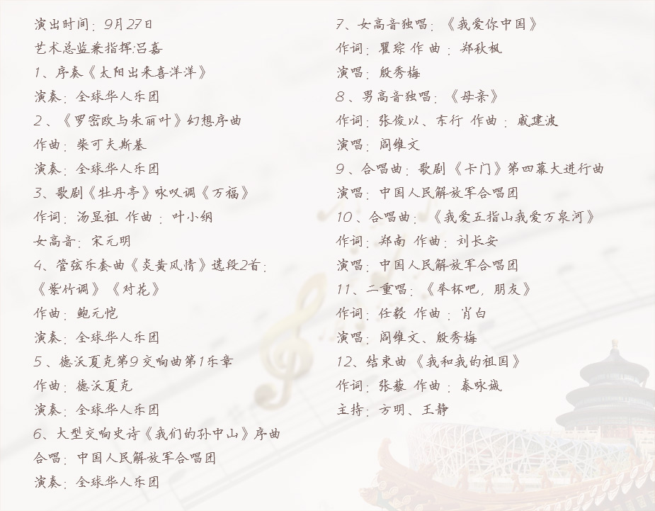 為慶祝中華人民共和國建國67周年,紀念孫中山先生誕辰150周年,國僑辦于9月24日在澳門大學大禮堂、9月27日在北京國家大劇院音樂廳舉辦“全球華人音樂會”。