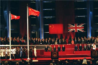 1997年7月1日零時(shí),灣仔會(huì)展中心新翼五樓大會(huì)堂。雄壯激昂的國(guó)歌聲中,鮮艷的五星紅旗與紫荊花區(qū)旗,相伴冉冉升起。這是一個(gè)莊嚴(yán)的宣示:中華人民共和國(guó)恢復(fù)對(duì)香港行使主權(quán),香港特別行政區(qū)正式成立。