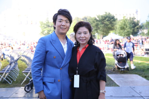 郎朗(左)與母親在獨立日演出現場的國會西草坪前合影。(美國《世界日報》/羅曉媛 攝)