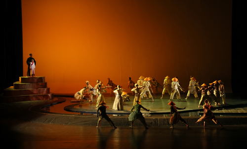 據(jù)介紹,戴維·寇克劇院改造一新,舞臺上,一條河流蜿蜒盤繞,寓意長江。30個多媒體屏幕鋪滿背景墻。從滿坡披綠的梯田,到斗笠蓑衣的農(nóng)夫,從拖著閃電的篆字,到剛勁飄逸的太極,該劇以賽珍珠名滿天下的作品《大地》為背景開篇,借中國唐代詩人張若虛名作“春、江、花、月、夜”五個意象,通過5位不同年齡的舞蹈演員,演繹賽珍珠的人生旅程。