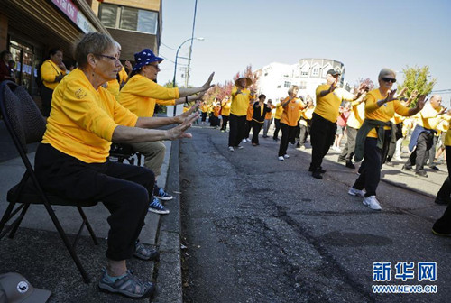 9月12日, 在加拿大溫哥華,太極愛好者齊集在街道上一起練習(xí)太極拳。當(dāng)日,約400名來自加拿大及美國西岸的太極愛好者,齊集在溫哥華一條街道上演練太極拳。活動(dòng)旨在向當(dāng)?shù)孛癖娡茝V太極運(yùn)動(dòng)并介紹其對(duì)健康的功效和好處。