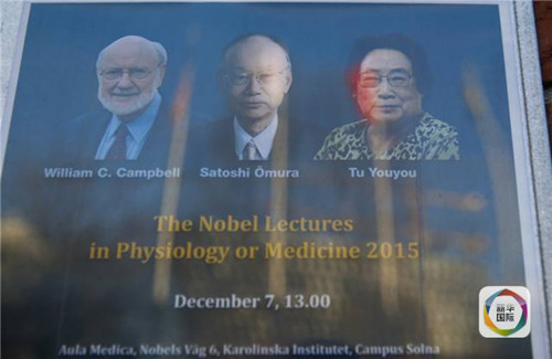 卡羅琳醫(yī)學(xué)院大門口迎風(fēng)飄揚著中國、日本、美國和瑞典國旗。早在講座開始前2小時,就已排起了入場長隊,千人禮堂座無虛席,所有人都期盼著聆聽“科研的故事”。身著寶藍色套裙的屠呦呦和另兩位該獎得主大村智及威廉·坎貝爾緩緩步入禮堂,一同與家人就座。在大村智和坎貝爾分別進行演講后,屠呦呦用中文進行了主題演講《青蒿素——傳統(tǒng)中醫(yī)給世界的一份禮物》。