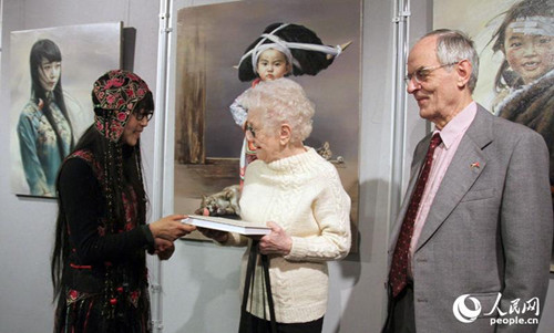 女畫家向來賓贈送畫冊。人民網(wǎng)記者管克江 攝