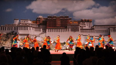 開幕式結(jié)束后,西藏自治區(qū)拉薩市歌舞團(tuán)為600位中德觀眾獻(xiàn)上了“魅力西部”歌舞演出,包括藏族舞蹈《家園》、《納木措之舞》、《圣地禮韻》、《扎西諧欽》,新疆舞《葡萄熟了》,蒙古舞《鶴之戀》,歌曲《貢布民歌》、《阿若拉納瓊》,藏戲清唱《祝福吉祥》,格薩爾說唱《賽馬》等獨(dú)具特色、原汁原味的中國西部地區(qū)傳統(tǒng)歌舞。演員們演技精湛,優(yōu)美歡快的舞步、高亢嘹亮的歌聲、華貴典雅的服飾讓現(xiàn)場觀眾贊嘆不已,充分展現(xiàn)了中國西部地區(qū)悠久燦爛的文化以及少數(shù)民族淳樸、熱情、好客的美好品格。演員們通過精彩表演征服了全場,掌聲和歡呼聲不斷。演員們還與現(xiàn)場觀眾互動,在演出結(jié)束時向觀眾拋送潔白的哈達(dá),將現(xiàn)場氣氛推向新的高潮,全場觀眾起立長時間為演員鼓掌。