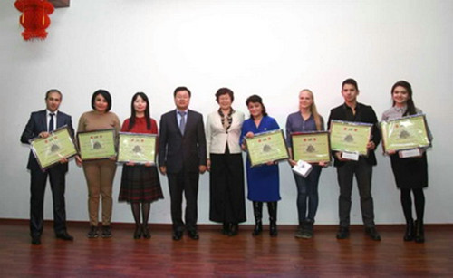 評(píng)審委員會(huì)對(duì)2016年“快樂(lè)中國(guó)行”參與人員提交的視頻、照片和文章進(jìn)行了評(píng)比,主持人現(xiàn)場(chǎng)宣布獲獎(jiǎng)師生名單,由孫大使和參與單位領(lǐng)導(dǎo)頒獎(jiǎng)。整場(chǎng)活動(dòng)氣氛熱烈友好,充滿(mǎn)了對(duì)中國(guó)之行的美好回憶。