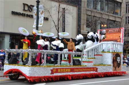 芝加哥東方藝術(shù)團(tuán)的眾多舞蹈愛(ài)好者在花車上下展示美輪美奐的京劇服飾和旗袍,美國(guó)民眾喜愛(ài)的大熊貓一路相伴,歡快的中國(guó)節(jié)日音樂(lè)環(huán)繞左右,喜氣洋洋。