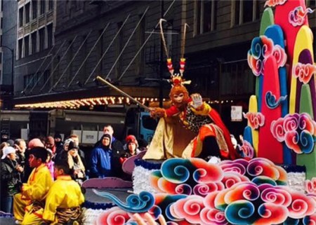 芝加哥希林華星藝術(shù)團(tuán)的花車主打“美猴王”形象,“小猴王”簇?fù)碓凇懊篮锿酢鄙磉?,矯健的身手和精湛的中國(guó)功夫表演成為游行隊(duì)伍中的明星。
