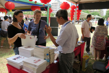 新春廟會(huì)現(xiàn)場(chǎng)張燈結(jié)彩,樂音悠揚(yáng)。坦桑尼亞中國文化中心以《絲路新韻》圖片展、中國美食雕刻藝術(shù)展示、寫春聯(lián)、學(xué)剪紙、書法體驗(yàn)、文化圖書展銷等豐富內(nèi)容宣傳中國文化,推介“一帶一路”倡議給中坦文化、經(jīng)貿(mào)往來帶來的良好機(jī)遇。廟會(huì)活動(dòng)熱鬧非凡,有的觀眾著迷于精美的果蔬雕刻,連續(xù)兩天都來到中心展位觀賞;有的觀眾頂著烈日,排隊(duì)領(lǐng)取自己所屬生肖的卡通圖案貼紙;有的觀眾流連往返于書籍展臺(tái)前,為終于淘到了心儀的中國版圖書,或得到了春聯(lián)和燈籠而滿心歡喜。