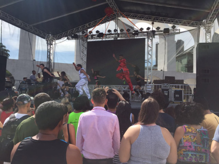 演員風(fēng)塵仆仆到達(dá)里約的當(dāng)天,沒有片刻休息即投入晚上的表演。節(jié)目包括新疆舞《掀起你的蓋頭來》、藏族舞《萬物生》、古典扇舞《秀色》、現(xiàn)代民間舞《詠春》、以及獨(dú)唱歌曲,街舞武術(shù)組合等十多個(gè)節(jié)目,精彩的表演贏得現(xiàn)場觀眾的熱烈掌聲喝彩。