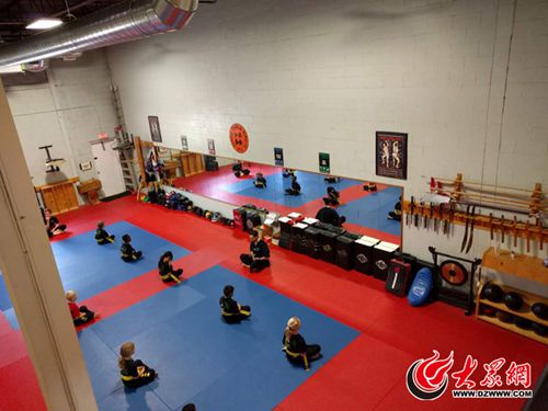 我看了兩個班的訓練:一個是年齡小的,在二樓看去,20個男女小學員中只有四五個華人小朋友,他們跟著教練學扎馬步、推掌、踢腿等靈活招數(shù)。第二波人數(shù)多一些,都是些大一點的少年且是清一色的歐裔白種人,教練換成男的,很有一些威武氣派。