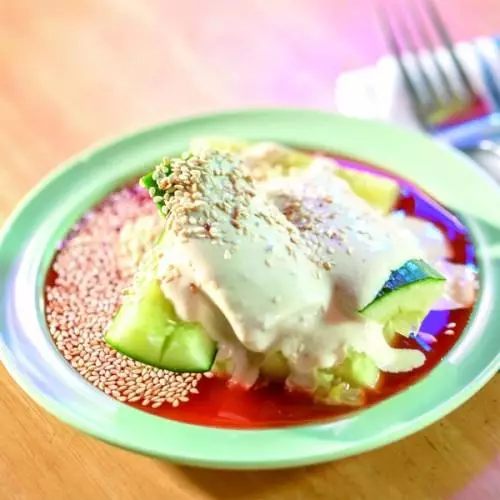 做法最特別的還要數(shù)超級(jí)漢堡餐廳——將參差不齊的黃瓜塊與味道濃烈的酸奶混合在一起,再撒上少許墨西哥青辣椒醬和芝麻棍面包屑,賣相十分“暗黑”……