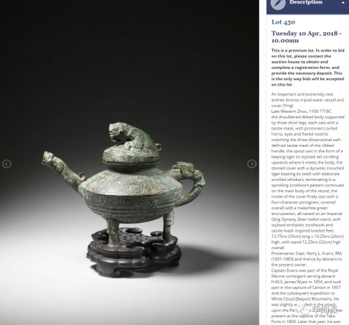除此之外,埃文斯還有兩件青銅藏品也一起被拍賣。一件是商代的尊,估價為4000至6000鎊。