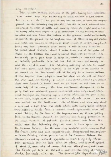 在10月25日這封家書中,“北京現(xiàn)在已經(jīng)幾乎是我們的了,好在前幾天我們要開火的時候,城門上豎起了白旗……第二天我們就要進入圓明園,那里只留下了300名看守的仆人和50人左右的士兵,他們沒有嘗試任何抵抗?!?/p>
