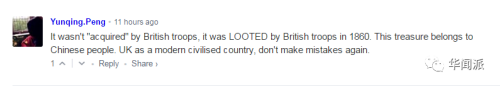 在網(wǎng)頁的下方就有中國網(wǎng)友評論到:“這根本不是英國軍隊‘獲得’(acquired),根本就是英國軍隊在1860年搶來(looted)的。這些寶貝是屬于中國人民的,英國作為一個現(xiàn)代文明國家,不應該讓歷史重演?!?/p>