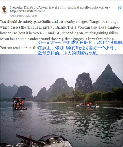 在美版知乎“Quora”網(wǎng)站上,有網(wǎng)友提問“應(yīng)不應(yīng)該選擇桂林作為自己到中國的旅游之地”,一名熱愛旅行的外國網(wǎng)友是這樣回答的: