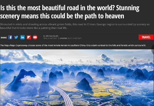 不只桂林的山水,廣西還有許多美景令外國網(wǎng)友贊嘆不已。廣西合那公路就曾在外國網(wǎng)友中刷屏,被稱為“仙境公路”。英國《鏡報(bào)》網(wǎng)站就曾以“這是世界上最美的公路嗎?迷人的風(fēng)景帶我們到人間天堂”為題報(bào)道過這條公路,稱這條公路周圍的風(fēng)景如油畫般美麗。