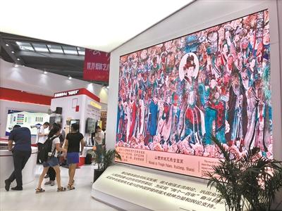 在各展位上非遺因?yàn)楦呖萍技夹g(shù)而越來越鮮活。在1號(hào)館山西展區(qū),會(huì)動(dòng)的永樂宮壁畫《朝原圖》吸引了眾多觀眾駐足觀賞拍照。仙鶴展翅飛翔、各路神仙衣袂飄飄,有的人物還會(huì)眨眼睛。這種數(shù)字影像技術(shù)與傳統(tǒng)藝術(shù)相結(jié)合的呈現(xiàn)方式,讓永樂宮壁畫活起來,體現(xiàn)了古老文化與最新科技的碰撞融合。